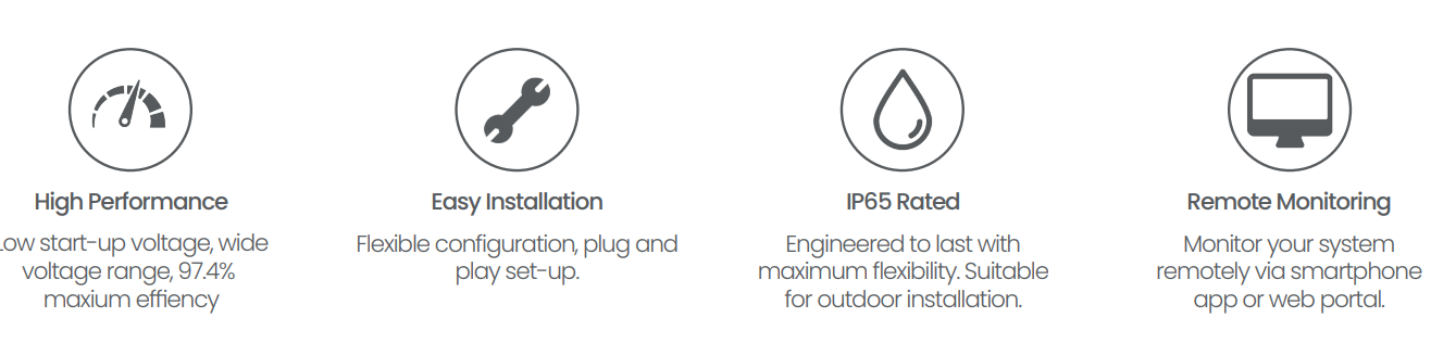 Offer a range of single MPPT single-phase inverters offering unparalleled efficiency and performance. Our range starts with the S700-G3 - small and compact and with an ultra-low start-up voltage that will ensure you harvest the most energy possible from your solar panels.